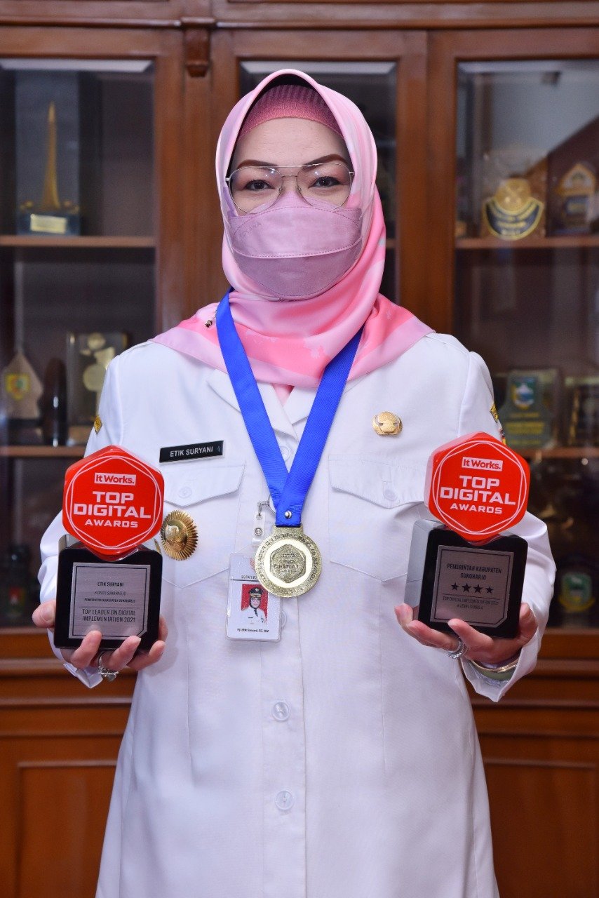 Dua penghargaan tersebut masing-masing “Top Leader On Digital Implementation 2021” kepada Bupati, Etik Suryani, yang secara langsung mendukung transformasi digital di Pemkab Sukoharjo. Hal itu berupa kebijakan umum berupa produk hukum baik pembentukan Perda, Perbup dan Keputusan Bupati yang didalamnya mendukung implementasi teknologi digital serta kebijakan dukungan anggaran.