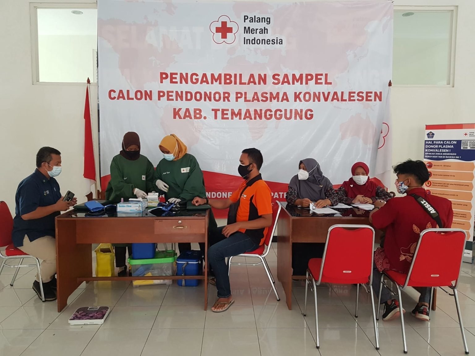 TEMANGGUNG – Para penyintas Covid-19 di Kabupaten Temanggung yang tergabung dalam Temanggung Covid-19 Survivor bekerja sama dengan PMI setempat, menjaring puluhan penyintas untuk Gerakan Donor Plasma Konvalesen (Gedor Lakon). Mereka menjalani skrining dan pengambilan sampel darah di PMI Temanggung, Kamis (12/8/2021).
